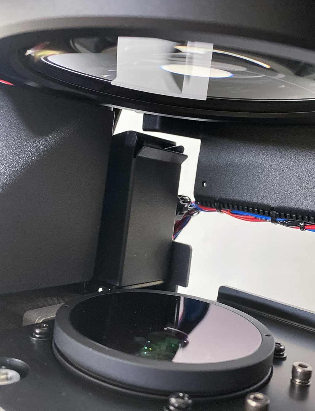 Das vollständige Schließen der Blenden bedingt eine „Stapelung“ der Blenden entlang der optischen Achse, was dazu führt, dass nicht alle vier Blenden gleichermaßen, in der Praxis aber dennoch ausreichend scharf, abgebildet werden können.