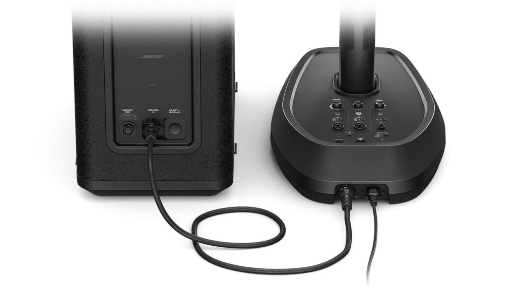 Sub-Verbindung Sub1 oder Sub2 lassen sich über ein Spezialkabel an den Sockel des L1 Pro32 ankoppeln und werden von hier komplett versorgt, eine eigene Stromversorgung wird nicht benötigt (Bild: Bose)