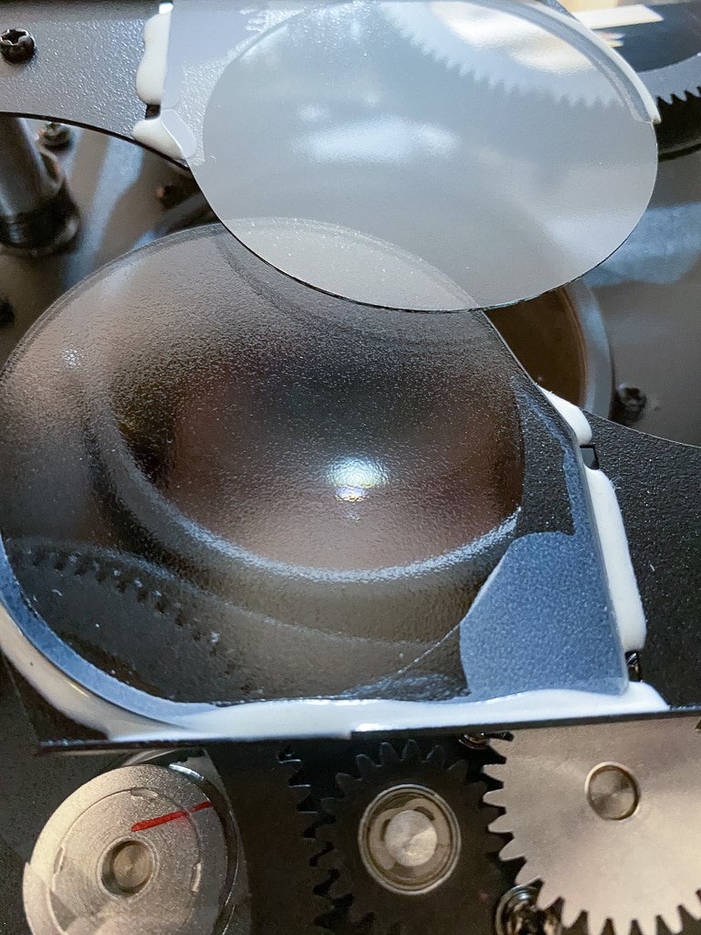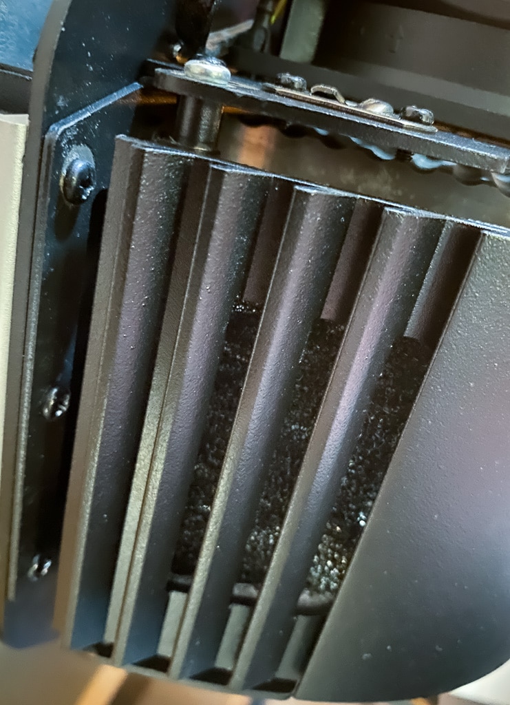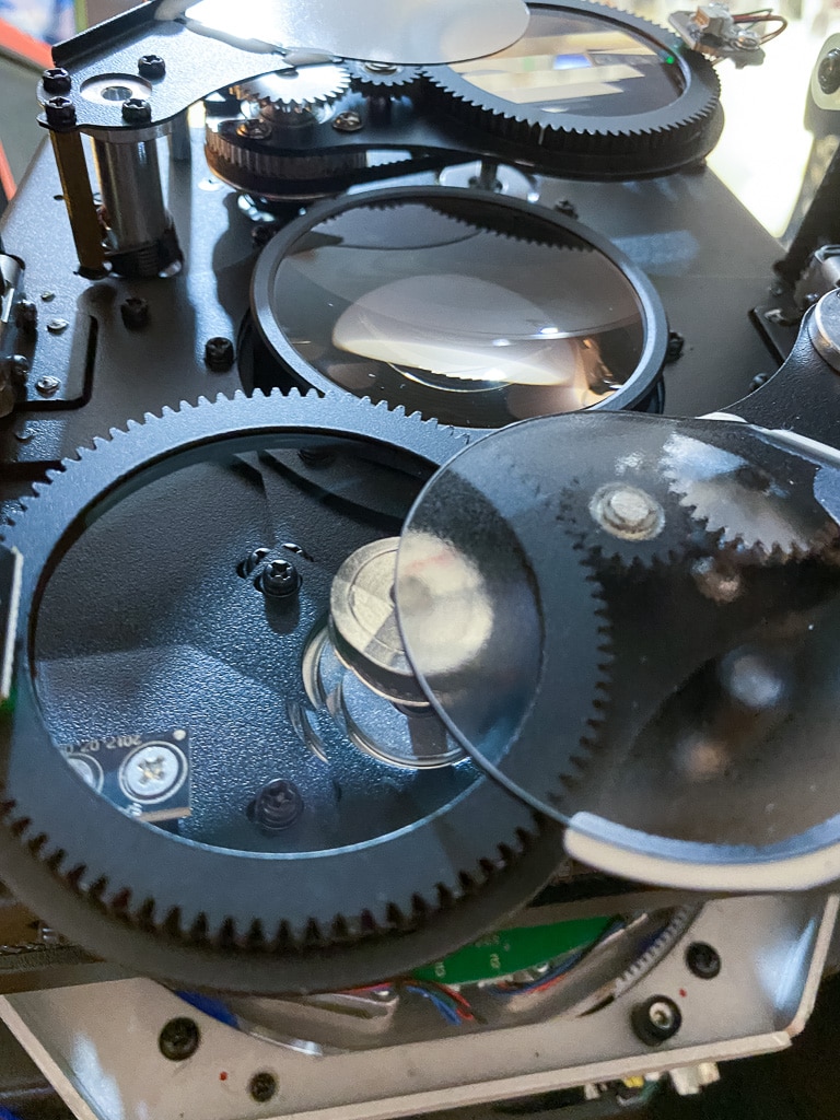 Das vierte Segment ist mit einer elf Zentimeter messenden Focus-Linse, sowie jeweils zwei Prismen und zwei Frostfiltern ausgestattet. Letztere Komponenten sitzen direkt hinter der Focus-Linse und werden daher beim Einsatz der Focus-Funktion zusammen mit durch den Gerätekopf gefahren. Da hier eine ganz ordentliche Masse bewegt wird, kommt es, je nach Stellung des Kopfes, schon einmal zu ganz leichten Vibrationen des gesamten Segments während der Bewegung, was jedoch optisch nicht ins Gewicht fällt.