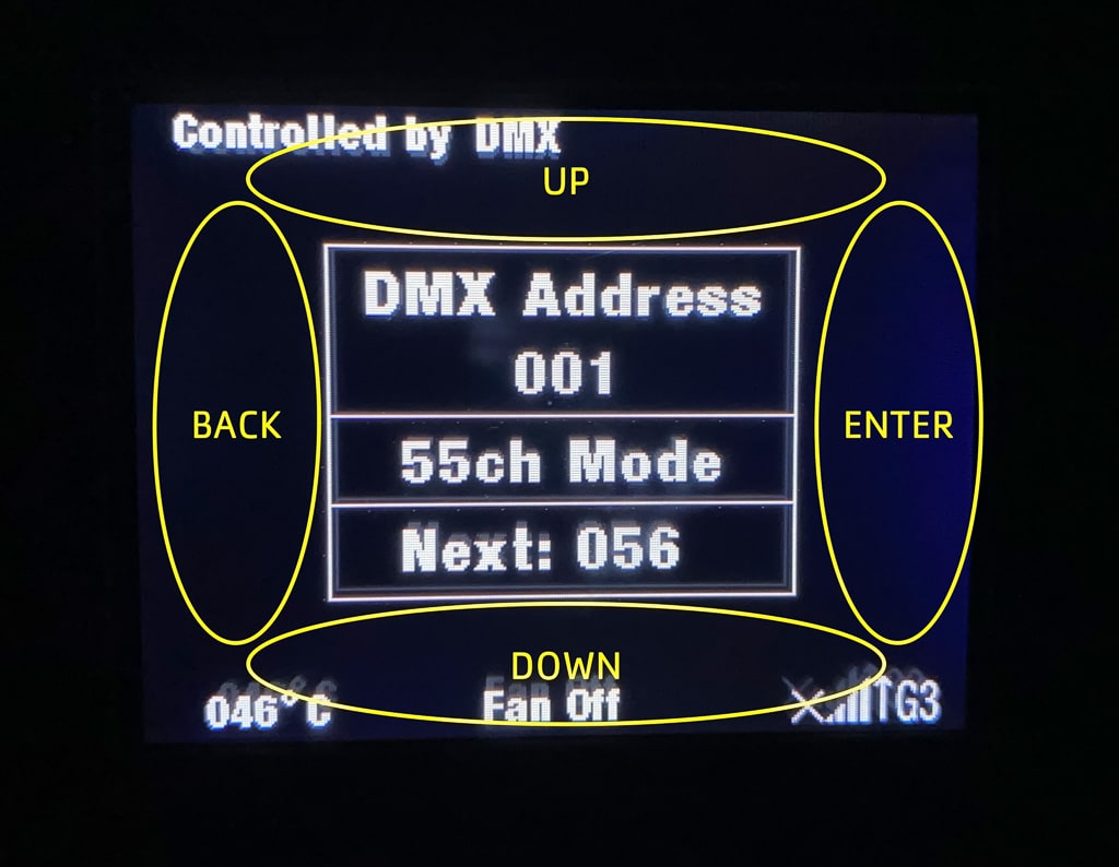 Ebenfalls mit Hilfe dieses Kanals kann der Pan-Bereich des Kopfes auf 540° oder 630° Bewegungsradius festgelegt werden. Die Ansteuerung des Opus X Profile kann in zwei Betriebsmodi erfolgen, die jeweils 37 oder 55 DMX-Kanäle beanspruchen.