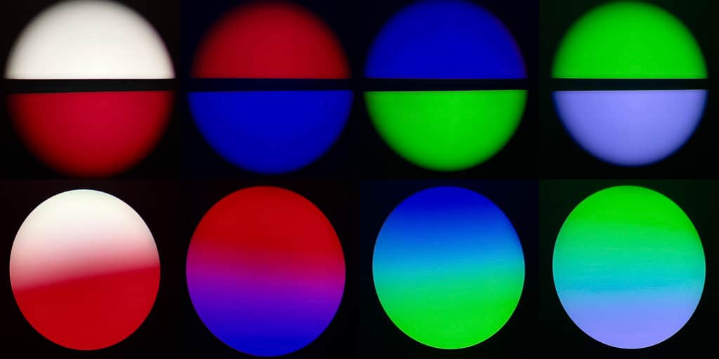 Alle vier dieser Funktionen werden mit Hilfe von jeweils zwei entsprechenden Farb-Flaggen gelöst, die sich gegenüberliegend auf jeder Seite des Strahlenganges befinden. Die Pärchen sind leicht versetzt zueinander angeordnet und liegen bei einhundertprozentigem Ansteuerungswert vollständig übereinander. In diesem Modul geht es jedoch wirklich sehr eng zu, und so hat es zumindest bei dem Testgerät akustisch den Anschein, als würden einige Flaggen-Pärchen teilweise aneinander reiben. Optisch und funktional ist an dieser Stelle jedoch keine Beeinträchtigung festzustellen.