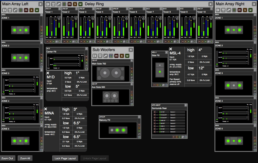 Compass ist die Meyer-Sound-Software zur Steuerung der Galaxy-Controller, der Beamforming-Lautsprecher CAL und auch der RMS-Funktionen. Von hier aus können alle Lautsprecher komplett einzeln oder gruppiert überwacht werden. Angezeigt werden die Aussteuerung aller Wege, die Temperatur und mögliche Fehler im System. Von der Software aus können die Lautsprecher einzeln oder in Gruppen gemutet oder auch zum Test solo geschaltet werden.