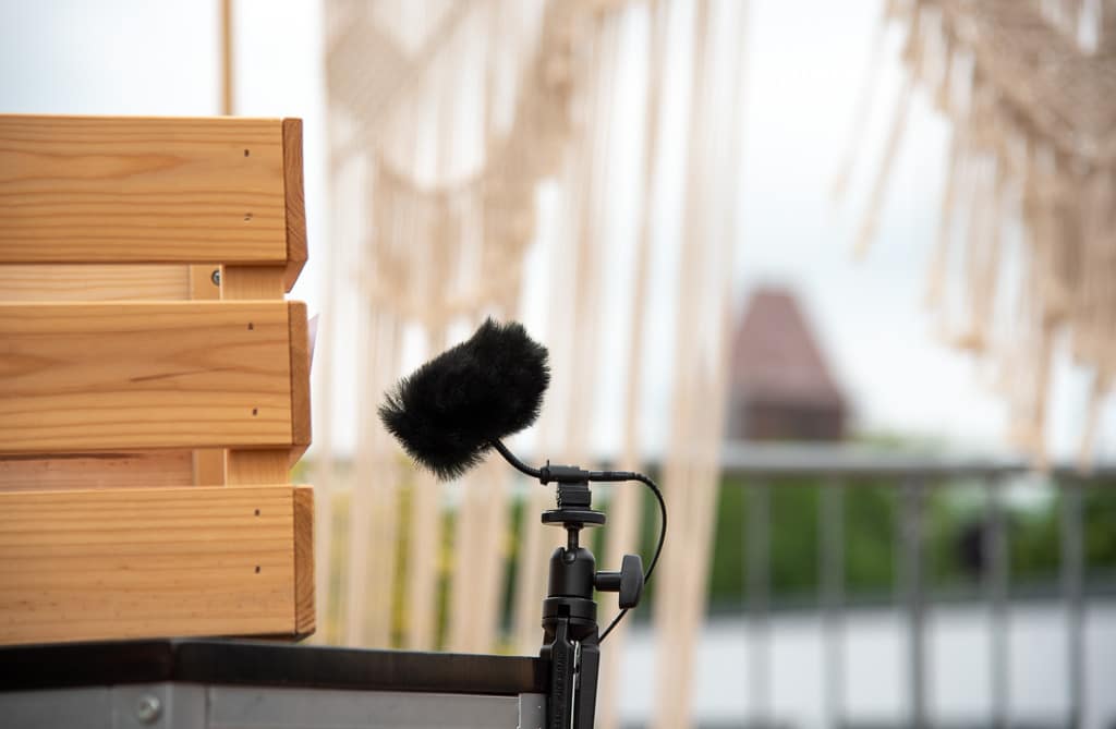 Als zusätzlicher Windschutz wurde der kleine Windjammer von Rycote drübergeknöpft. Von hier ging der Ton parallel auf eine kleine Beschallungsanlage plus einen Zoom-Videofeed. Als wenn das nicht schon schwierig genug wäre, pfiff dann noch, verbunden mit ein paar letzten Regentropfen, eine kräftige norddeutsche Brise mit sicher vier Windstärken über die (Pandemie-bedingt eh kleine) Aktionsfläche. Die Frage „ob das wohl überhaupt klappt“ stellte sich mangels besserer Alternative aber überhaupt nicht mehr. Auch eine Verlegung in einen Innenraum war nicht nur wegen der tollen Aussicht, sondern der so einfach hygienisch besten Wahl keine Option – dann doch lieber ein paar Tropfen Wasser abbekommen.#