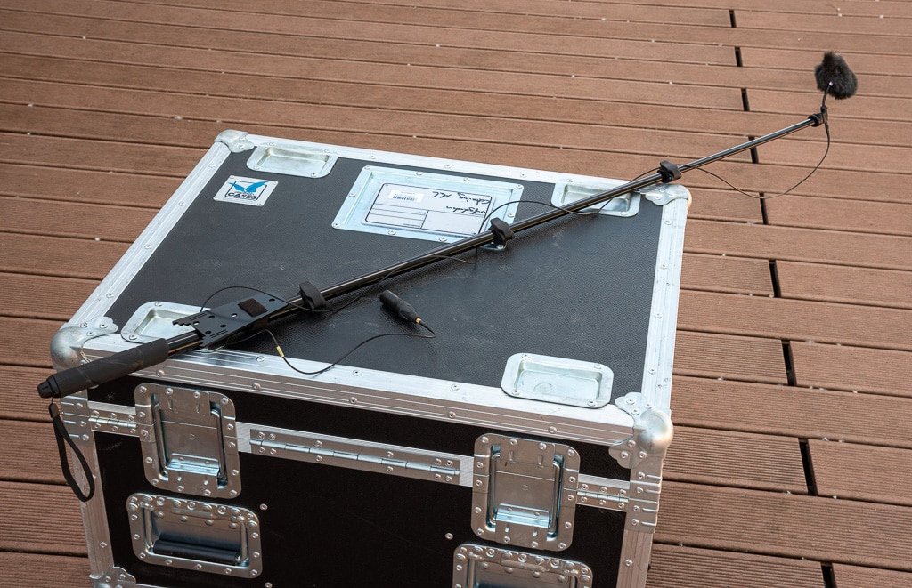 Neu hinzugekommen ist jetzt das Interview-Set mit einem Teleskop-Ausleger von Manfrotto, auch bekannt als Gopro-/Selfie-Stativ. Dieser ausziehbare Boom nimmt am Ende über ein kleines Schraubgewinde den zierlichen Schwanenhals samt Mikrofon auf. Die Mikrofonhalterung ist so gestaltet, dass das Mikrofon bereits einen Winkel einnimmt – je nach Montageart muss man die Aufnahmerichtung im Auge behalten, damit man das Mikro nicht „rückwärts“ montiert. Das 1,80 m lange Kabel kann zwar nicht im Ausleger verschwinden, es ist aber so dünn und leicht, dass man es sehr unauffällig mit ein paar Windungen um ihn herumgewickelt ist.
