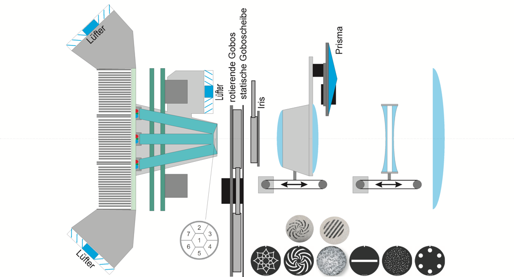 Doppelgobo „Fan“ mit Prisma und LED-Engine mit Farbeffekt