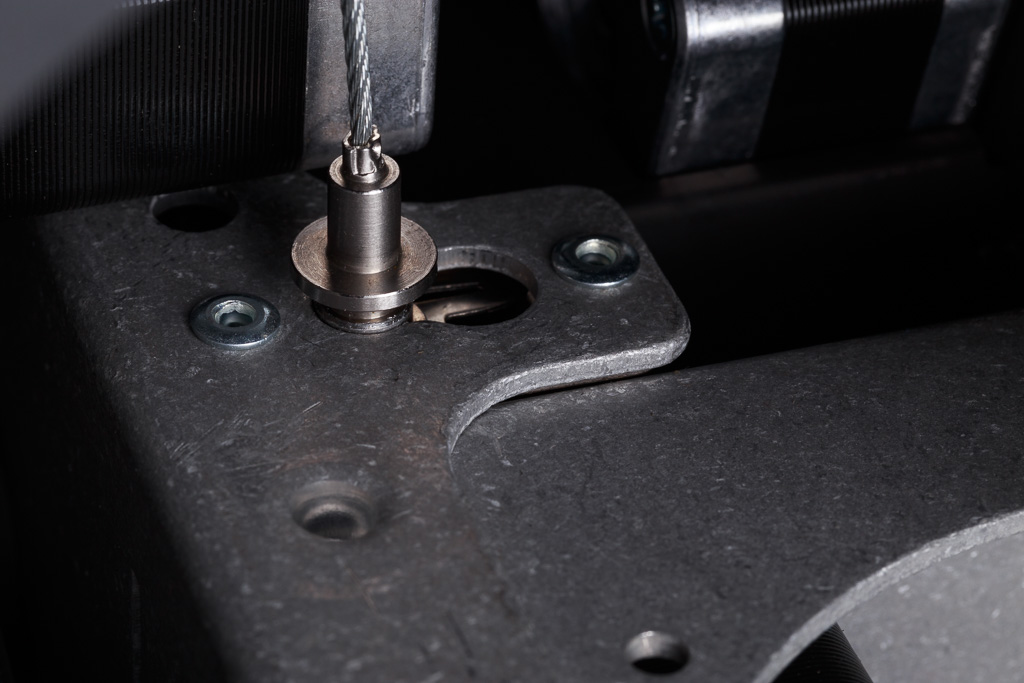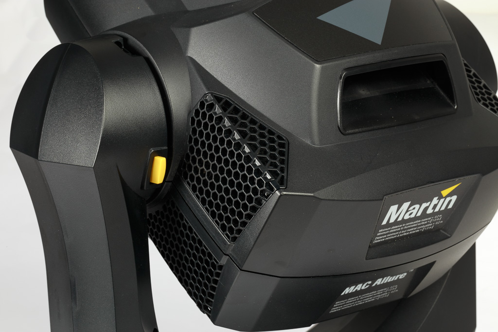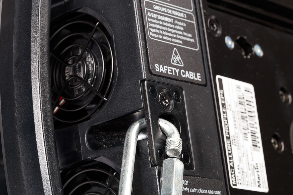Die obligatorische Verriegelung der Achsen ist beim MAC Allure Profile nur auf der Tilt-Achse umgesetzt, dafür stilvoll in der gelben Martinfarbe. Eine Freude sind auch die Aufnahmen für das Sicherheitsseil: Nicht nur, dass „deutsch dimensionierte“ Seile mit ihren Verbindungsgliedern hindurchpassen, es sind sogar zwei gegenüberliegende Aufnahmen vorhanden, so dass man ein Seil von einer auf die andere Seite anschlagen kann, wenn es aus optischen Gründen opportun ist.