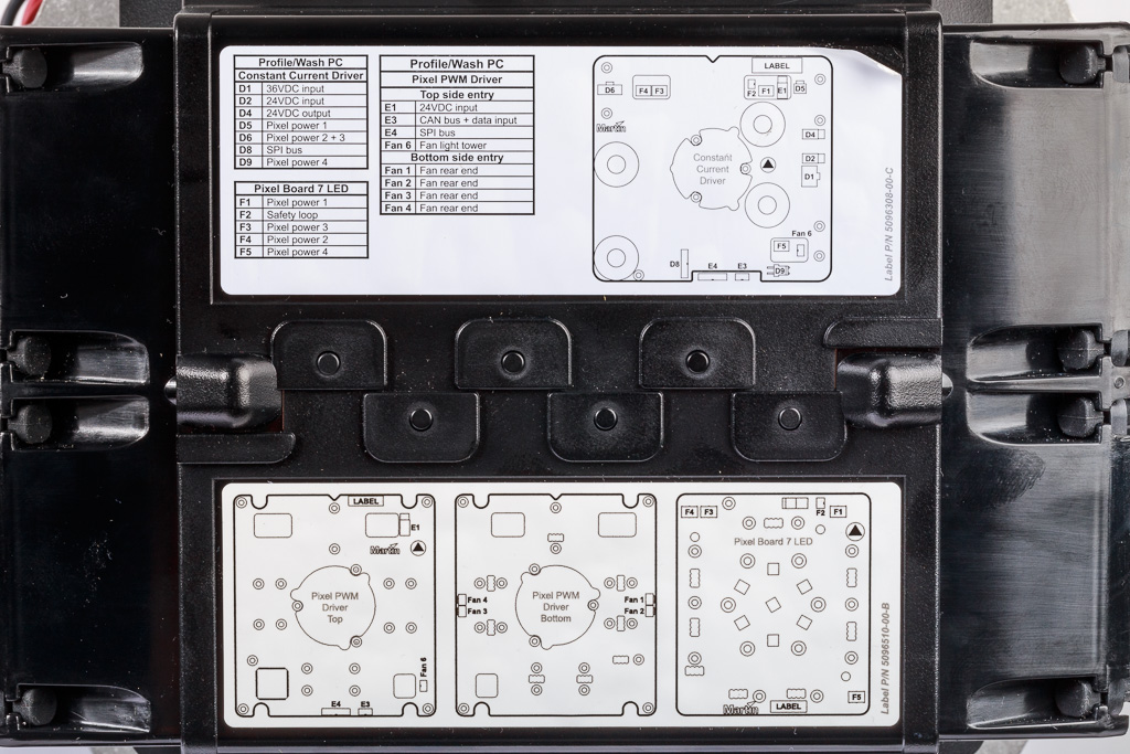 Martin hat mit dem MAC Allure Profile diesen Schwachpunkt der bisherigen Vollfarb-LED-Engines aufgegriffen und mit ihrer neuen LED-Engine genau diesen Gestaltungsspielraum vervielfacht – um genau zu sein: versiebenfacht. Denn hier wird nicht versucht, die Mehrfarb-Lichtquelle möglichst kompakt und homogen zu gestalten, sondern man splittet die Lichtquelle wie bei einem Moving Head Bee-Eye Washlight zu mehreren unabhängigen Farbquellen in Wabenanordnung. Wenn man dann den Fokusbereich so erweitert, dass auch die Lichtquelle scharf abgebildet werden kann, so erhält man einen Multi-Farb-Beam mit dem Spot. Das ist derzeit auf dem Markt einzigartig und konnte bisher eigentlich nur mit mehreren Spots zusammen realisiert werden. Doch beschäftigen wir uns erst einmal mit dem allgemeinen Aufbau der Lampe.