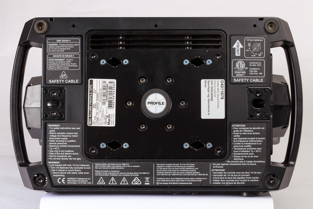Aber wer den MAC Allure Profile im Sichtbereich von Zuschauern platzieren will, ohne dass der Scheinwerfer mit einem Display oder Kabellage ablenken soll, wird diese blanke Fläche lieben. Zusammen mit der dezenten Sicherungsseil-Befestigungsmöglichkeit denkt man eben auch an die Galakunden. Die Camlock-Adapter liegen eng beieinander, so dass der Profiler auch in kleinen Trussen noch zwischen das Bracing passt. Vorteil hierbei ist auch, dass man die Camlock-Adapter 90° gedreht für eine seitliche Befestigung anschlagen kann.