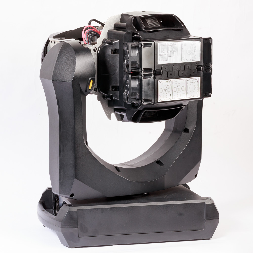 Die vordere Kopf-Optik wie auch die LED-Engine sind an Trägerplatten befestigt. Es finden einige Kunststoffteile Anwendung, die geschickt mehrere Haltefunktionen vereinen. Zeitweise hat man das Gefühl, dass der Samsung-Fernseher hier Know-How-Transfer geleistet hat. Alles in allem macht die Mechanik einen sehr durchdachten und soliden Eindruck. Man nutzt aktuelle Techniken wie z. B. die Feedback-Sensorik, die nicht mehr mit Gabellichtschranken detektiert, sondern über Näherungssensoren an der rückseitigen Welle des Schrittmotors die Bewegungen erfassen. Damit wird wieder ein Schritt zur Betriebssicherheit geleistet.