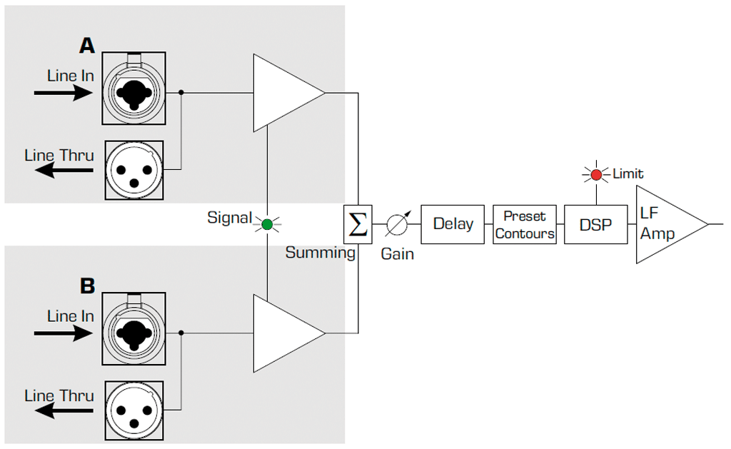 Abb. 6 zeigt die Filterfunktionen der verschiedenen Setups. Diese unterscheiden sich durch die Trennfrequenz zum Topteil von 80 Hz oder 100 Hz und durch die schaltbare Option „deep“, wo sich die untere Eckfrequenz dann von 41 Hz auf 35 Hz verschiebt. Einsetzen würde man „deep“ z. B. bei DJ-Events, wo viel Tiefbass gewünscht ist.