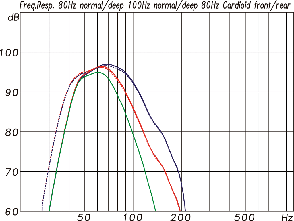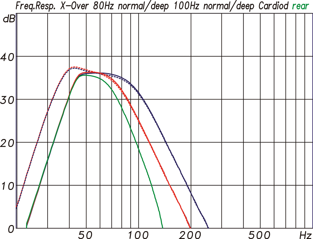 Filterfunktionen des Elektronikmoduls für 80 Hz (rot) und 100 Hz (blau) Trennfrequenz sowie für die Einstellungen Standard und Deep (gestrichelt). In Grün die Filterkurve für den Rear-Speaker in der Cardioid-Anordnung (Abb. 6) (Bild: Anselm Goertz)