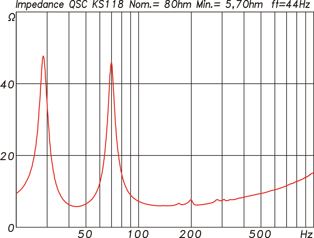 In Abb. 1 erkennt man die beiden ungefähr gleich hohen Impedanzspitzen und das dazwischen liegende Minimum bei 44 Hz, wo sich die Abstimmfrequenz des Bassreflexresonators befindet. An dieser Stelle liegt auch das globale Impedanzminimum mit einem Wert von 5,7 Ω.