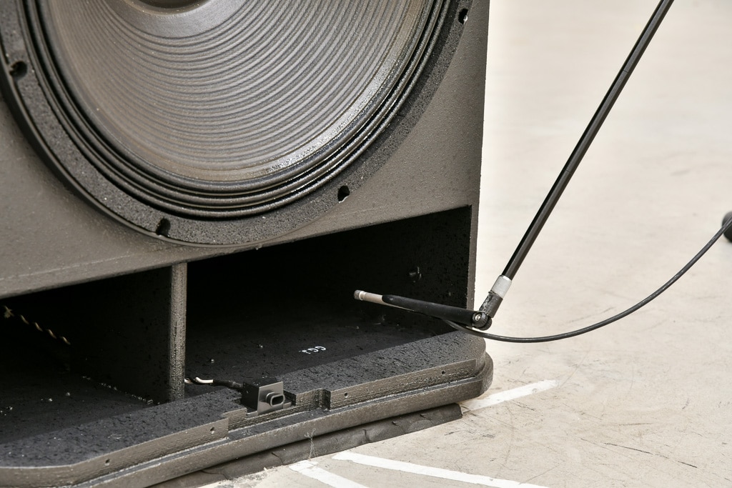 Für die ersten Messungen der Subwoofer-Komponenten wurde zunächst die interne Elektronik abgeklemmt und der Treiber direkt am Messsystem angeschlossen. Das zugehörige Kabel erkennt man auf dem Foto, wo es aus dem Bassreflexport kommt.