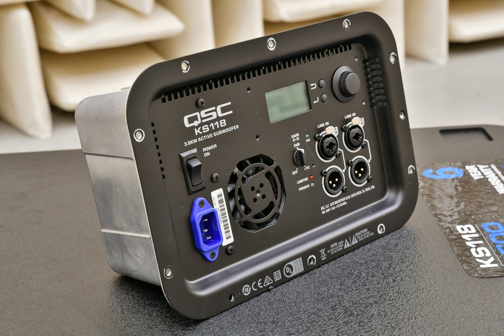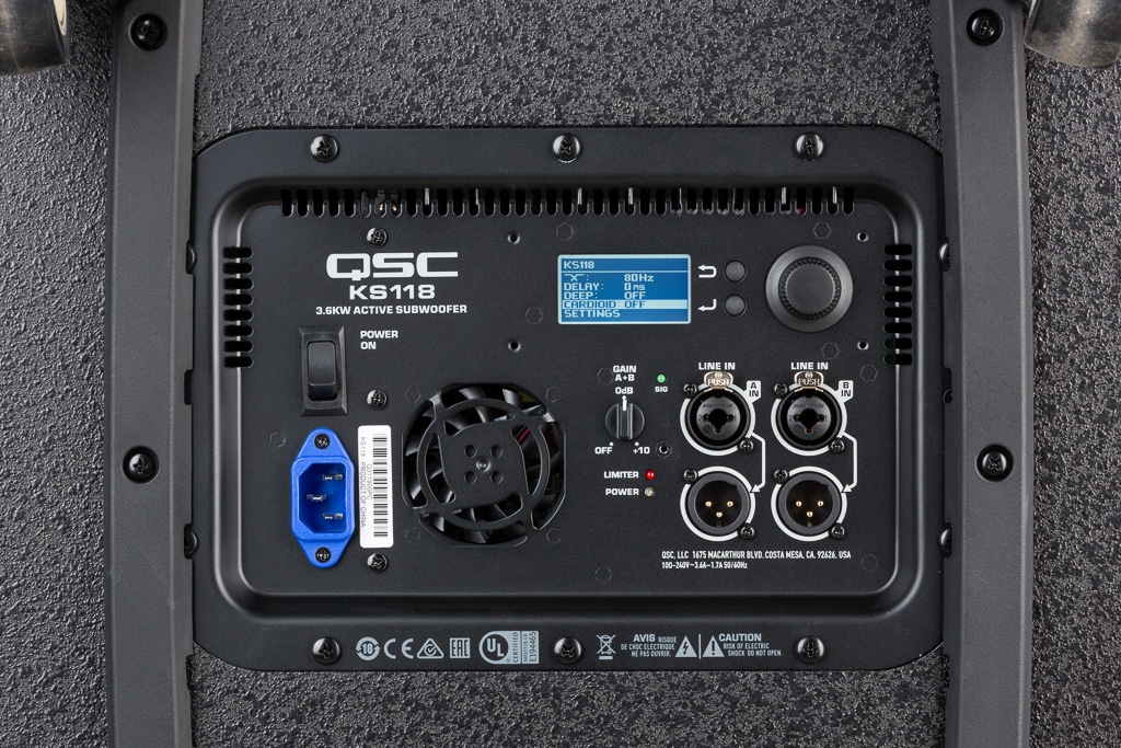Das Elektronikmodul mit einer Class-D-Endstufe ist auf der Rückseite eingebaut. Durch eine tiefe Metallschale und zusätzliche seitliche Gleitschienen sind Anschlüsse, Display und Bedienelemente beim Transport gut geschützt. Das Modul verfügt über zwei Eingänge mit direkten Link-Ausgängen. Die Signale der beiden Eingänge werden intern summiert, so dass der KS118 auch als Mono-Subwoofer eingesetzt werden kann.