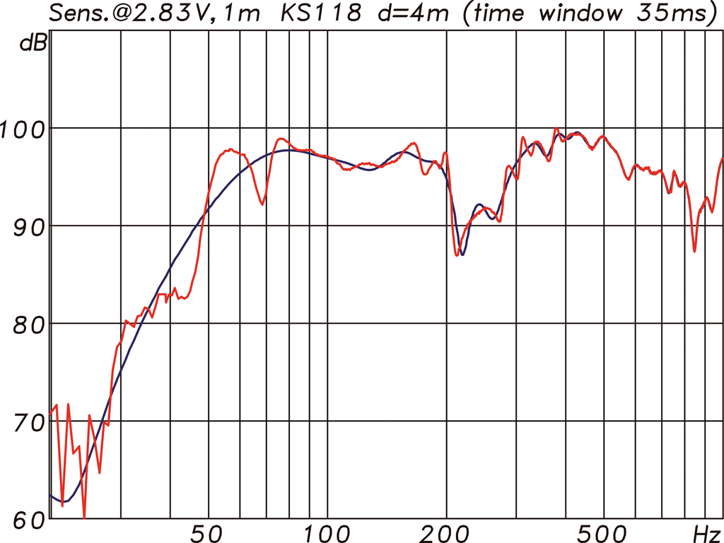 Frequenzgang des KS118 im reflexionsarmen Raum in 4 m Entfernung gemessen. Unterhalb von 100 Hz sind die Störungen durch den Raum zu erkennen, da hier keine hinreichende Reflexionsfreiheit mehr gegeben ist. Für die blaue Kurve wurden die Reflexionen durch eine Fensterung der Impulsantwort ausgeblendet. Allerdings geht damit auch Auflösung in der Darstellung des Frequenzgangs verloren (Abb. 2) (Bild: Anselm Goertz)