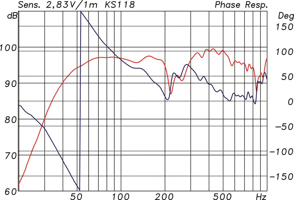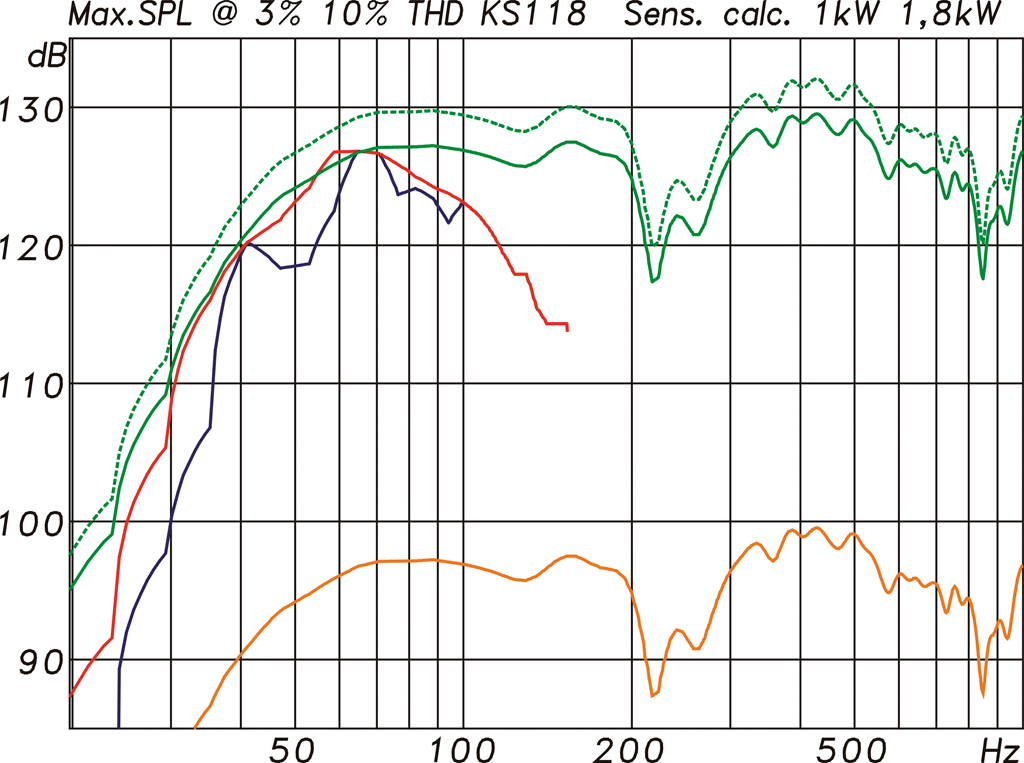 Diese Kurve liegt für den KS118 knappe 3 dB höher als die tatsächlichen Messwerte. Mögliche Verluste gegenüber der rechnerisch ermittelten Kurve entstehen durch Powercompression, Limitierungen der Endstufe und natürlich durch die bei hohen Pegeln entstehenden Verzerrungen des Treibers. Verschiebt man die Kurve 1 W/1 m nur um 30 dB nach oben, entsprechend einer Leistung von 1 kW, dann entspricht das recht gut dem Messergebnis. Der Leistungswert von 1 kW dürfte auch der tatsächlichen Leistung der Endstufe für ein 185 ms langes Sinussignal entsprechen.