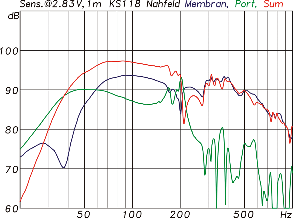 Eine weitere Möglichkeit ist die Nahfeldmessung, die auch ohne reflexionsarmes Umfeld durchgeführt werden kann. Für die Nahfeldmessung wird das Mikrofon direkt vor den Strahlerflächen platziert. Diese werden dann alle einzeln gemessen. Beim KS118 sind das der Bassreflexport und natürlich die Membran des Treibers. Abb. 3 zeigt die so gemessenen Kurven für den Port (grün) und für die Membran (blau). Anschließend werden diese Kurven addiert.