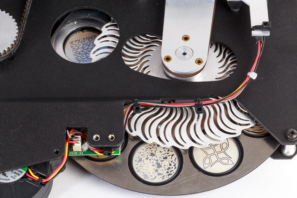 Wie beim T1 auch besitzt das Animation-Wheel eine Steuerfunktion für ein sequentielles Hinein- und Hinausfahren in den Strahlengang, anstatt die Rotationsrichtung ändern zu können. Dafür ist das Effektrad in einem sehr harmonischen Wellendesign ausgeführt, welches sogar am Rand hin wellig endet. Das ist natürlich für das pulsierende Rein- und Rausfahren aus dem Strahlengang eine wesentlich schönere Erscheinung, als wenn wie sonst üblich einfach eine schlichte Begrenzung vorliegt.