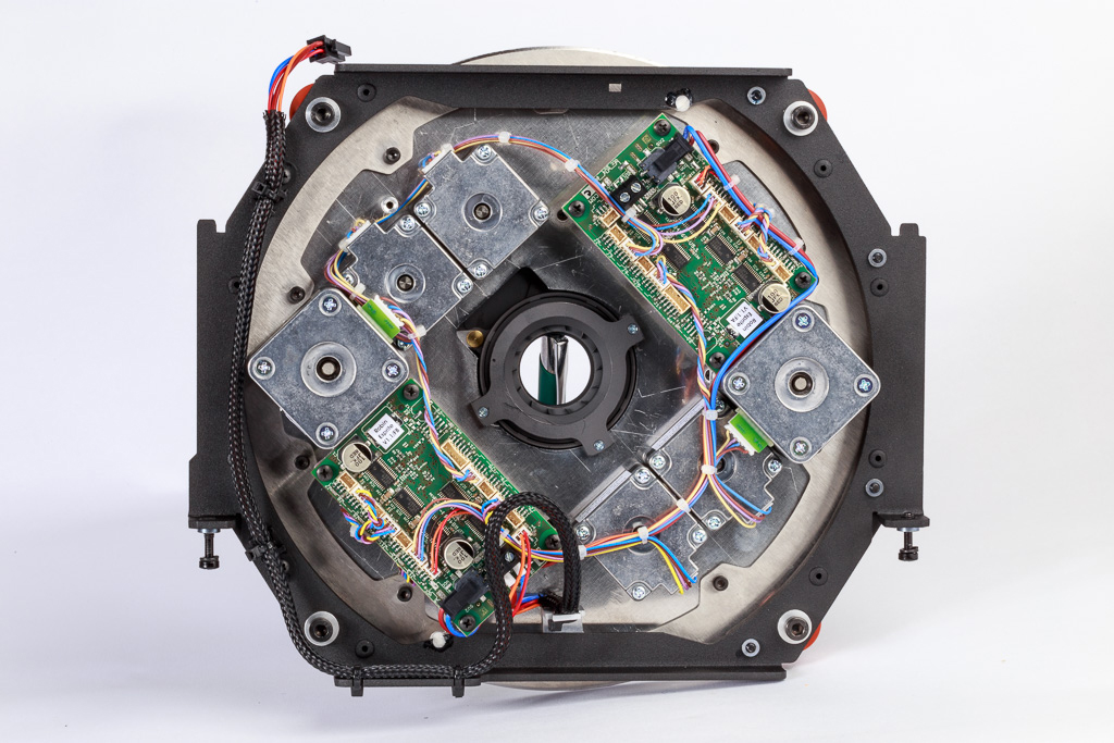 Hier wird der modulare Aufbau unterbrochen. Zum Glück muss man nicht oft an der CMY-Farbmischeinheit herumschrauben, denn dazu müsste man die beiden Trägerplatten demontieren. Die Demontage der Gehäuseschalen des Kopfes ist mit dem Lösen von zwei Schnellspannschrauben umgesetzt, wobei das Fangseil für die Gehäuseschale ebenfalls mit dem gleichen Schnellschrauben-System gesichert ist. Eine sehr wertige und praktikable Lösung!