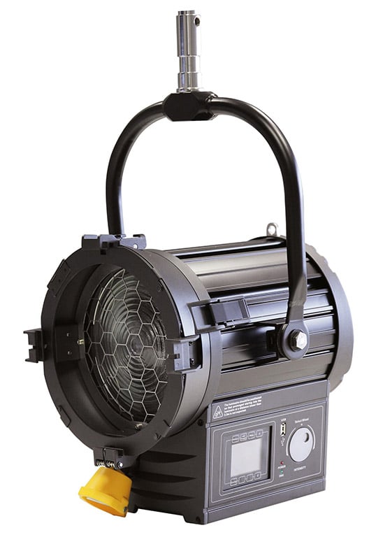 Strand ist ein Urgestein im Veranstaltungsmarkt – lange bevor das Wort „Event“ gebräuchlich wurde. Dann wurde es lange still um den einstigen Marktführer. Jetzt – mit Philips als Eigentümer im Rücken – werden wieder neue Produkte entwickelt. Das Ergebnis können wir am 200F TV sehen: Die neue Stufenlinse vereint die langjährige Erfahrung der Firma Strand, kombiniert mit dem neusten Know-how des PhilipsKonzerns. Bei der LED-Engine handelt es sich um ein Weißlicht-Array, bei dem die einzelnen blauen Chips mit einer Phosphorschicht überzogen sind. Ein NTC auf dem Board meldet die aktuelle Temperatur an die Steuerung zurück. Das Board ist auf eine Wärmetauscherplatte aufgepresst, welche die Wärme über Heatpipes zu den dahinter sitzenden Kühlblechen verteilt und mittels Lüfter zwangsgekühlt wird. Es gibt drei Lüftermodi, wobei die Lichtleistung beim Silent-Mode deutlich gesenkt wird. Der Lüfter dreht in diesem für Geräusch-sensible Orte konzipierten Modus zwar auch, aber deutlich langsamer als in den beiden anderen Modi. Das Array wird hermetisch gegen Schmutz abgekapselt, wobei der Rahmen gleichzeitig als Träger einer Linse dient, die dafür sorgt, dass die 175-mm-Fresnellinse optimal ausgeleuchtet wird. Die Lichtqualität ist ein Zusammenspiel aus LED-Engine mit Primärlinse und der Stufenlinse des Scheinwerfers. Dabei ist die Fresnellinse fix, während die LED-Engine nebst Kühlkörper über eine Spindelführung im Abstand zur Linse variiert wird. Wie es für Weißlicht-LEDs typisch ist, ist das Rot R9 ein wenig schwächer ausgeprägt. Gleiches gilt auch für die blaue Testfarbe, wobei der Chip selbst Blau in Mengen produziert, das aber leider nicht die Wellenlänge der Testfarbe trifft. Eine Beurteilung auf Basis des CRI-Indexes ist bei schmalbandig emittierenden LEDs daher immer problematisch: Obwohl eigentlich genügend Farbe vorhanden ist, kann der Wert schlecht ausfallen, wenn sie „knapp daneben liegt“. Der umgekehrte Fall ist natürlich auch möglich – dann wird diese Farbe förmlich „gepimpt“. Auch eine Erweiterung der Testfarben (wie beim TL-CI-Wert) ändert prinzipiell nicht die Gefahr einer Fehlbewertung schmalbandiger Farb-LEDs. Heute wird immer mehr das Messverfahren TM30 verwendet, das zum CRI noch den Farbraum in die Betrachtung einschließt. Die Farbtemperatur sitzt gut auf der Plankschen Kurve, so dass ein Grünoder Magenta-Stich in der Kamera nicht zu erwarten ist. Man hat beim Weißlicht-Array sowieso keine Möglichkeit, einen Shift ins Grüne oder Magenta durchzuführen. Bei der Betrachtung des Lichtwurfs ist man über die Homogenität entzückt: Der Strand 200F TV besticht mit einer einwandfreien, homogenen Ausleuchtung. Nur im Randbereich wird die Lichtfarbe aufgrund der Phosphorschicht, der Geometrie und Optik ein wenig gelblicher. So wird dort eine Lichtfarbe von nur noch 5.200K gemessen, während im Zentrum eine leichte Erhöhung von 5.800K festzustellen ist. Der Zoombereich ist Stufenlinsen-typisch und gut gelungen, ohne dass Haloringe oder andere störende Effekte auszumachen sind. Das Lichtfeld bleibt auch in Spotstellung rund. Die Torklappen arbeiten einwandfrei und deren Schatten sind gerade und ohne nennenswerte Multiquellenabstufungen. Kurzum: mit dem Licht arbeitet man gerne.