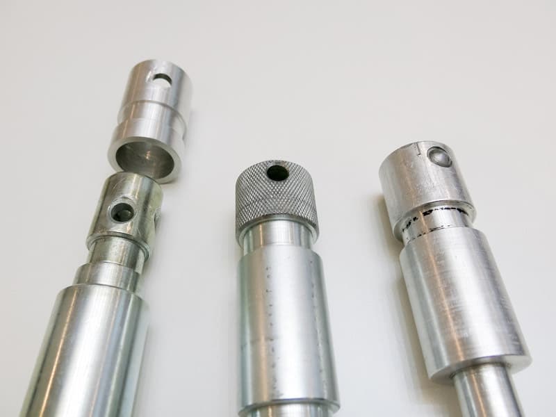 Englischer TV-Zapfen mit Adapterhülse für den Einsatz im RESBIG one, TV-Zapfen mit angerauhtem Kopf für kräftigere Verdreh-Arretierung und TV-Zapfen mit Nase für definierte Einbaulage und natürlich verdrehsicher (v.l.n.r.) (Bild: Herbert Bernstädt)