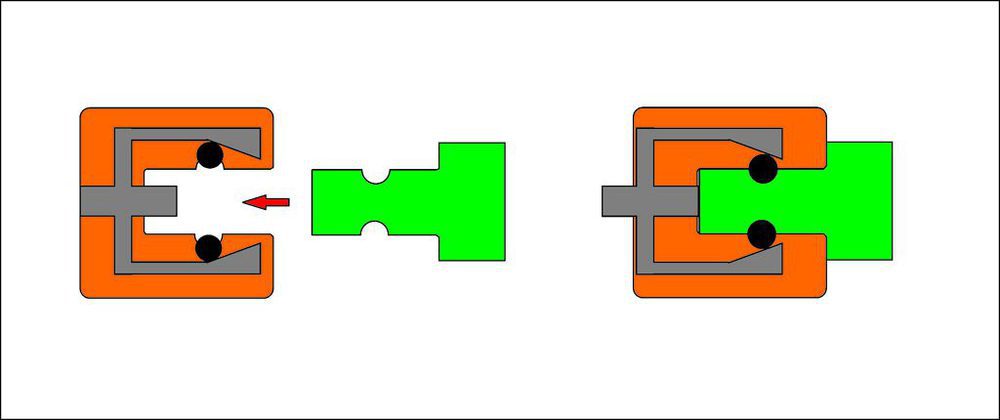 Prinzip ResbigOne Mit dem Einschieben des Zapfens werden Bolzen in die Nut des Zapfens geschoben, bis eine Mechanik die Verbindung verriegelt und damit eine eigensichere Verbindung hergestellt ist (Bild: Resbig)