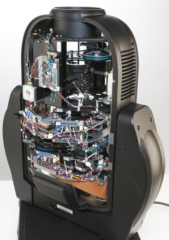 Das Herzstück des Kopfes, der einen Panbereich von 540° und einen Tiltbereich von 270° abdeckt und in beiden Bereichen von nur je einem Schrittmotor angetrieben wird, besteht aus einem Philips MSR Gold Fast-Fit Leuchtmittel mit einer Leistung von 1.200 W und einer Farbtemperatur von 6.000 K. Diese Lampe ist jedoch speziell darauf ausgelegt, durch „Übertaktung“ eine Leistung von ca. 1.400 W zu liefern, was eine höhere Umdrehungszahl der insgesamt neun verbauten Lüfter bedeutet. Die durchschnittliche Lebensdauer des Leuchtmittels, dessen Sockelform sowohl die einfache Montage als auch die servicefreundliche Justage über nur drei Punkte ermöglicht, ist bei „normalem“ Betrieb von Herstellerseite aus mit ca. 750 Stunden angegeben.