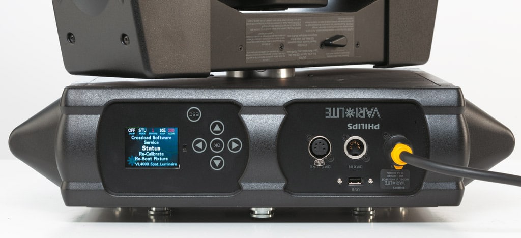 Auch beim Display bleibt der Hersteller seiner Linie treu, wie der VariLite VL4000 Spot Luminaire beweist: Wie bereits bei den Modellen vorangegangener Produktserien verbaut man keine berührungsempfindlichen Bildschirme. Dieses tut der Sache aber insofern keinen Abbruch, als dass die vorzunehmenden Einstellungen auch über die vier Navigations- und die beiden Funktionstasten (und nicht zuletzt durch eine gut strukturierte Menüführung) auch per Tastendruck schnell und zuverlässig vorgenommen werden können.