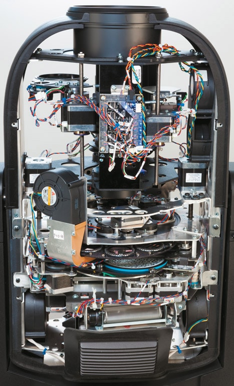 Ein weiteres Modul, welches im hinteren Bereich des Kopfes nahe der Lampen- und Reflektoreinheit untergebracht ist, beherbergt die unterschiedlichen Komponenten für die Veränderung der Farben und die voneinander unabhängigen Komponenten für die Shutter- und Dimmerfunktionen. Dieses Modul ist neben einem CMY-Farbmischsystem und einem stufenlosen CTO-Filter im Weiteren mit zwei festen Farbrädern ausgerüstet, auf denen sich jeweils fünf auswechselbare Farbfilter plus Weiß befinden. Hier wiederum handelt es sich übrigens sowohl bei dem einen als auch bei dem anderen Farbrad um fünf „richtige“ Farben, und nicht – wie vielleicht zu erwarten wäre – um Korrektur- oder Kosmetikfilter.