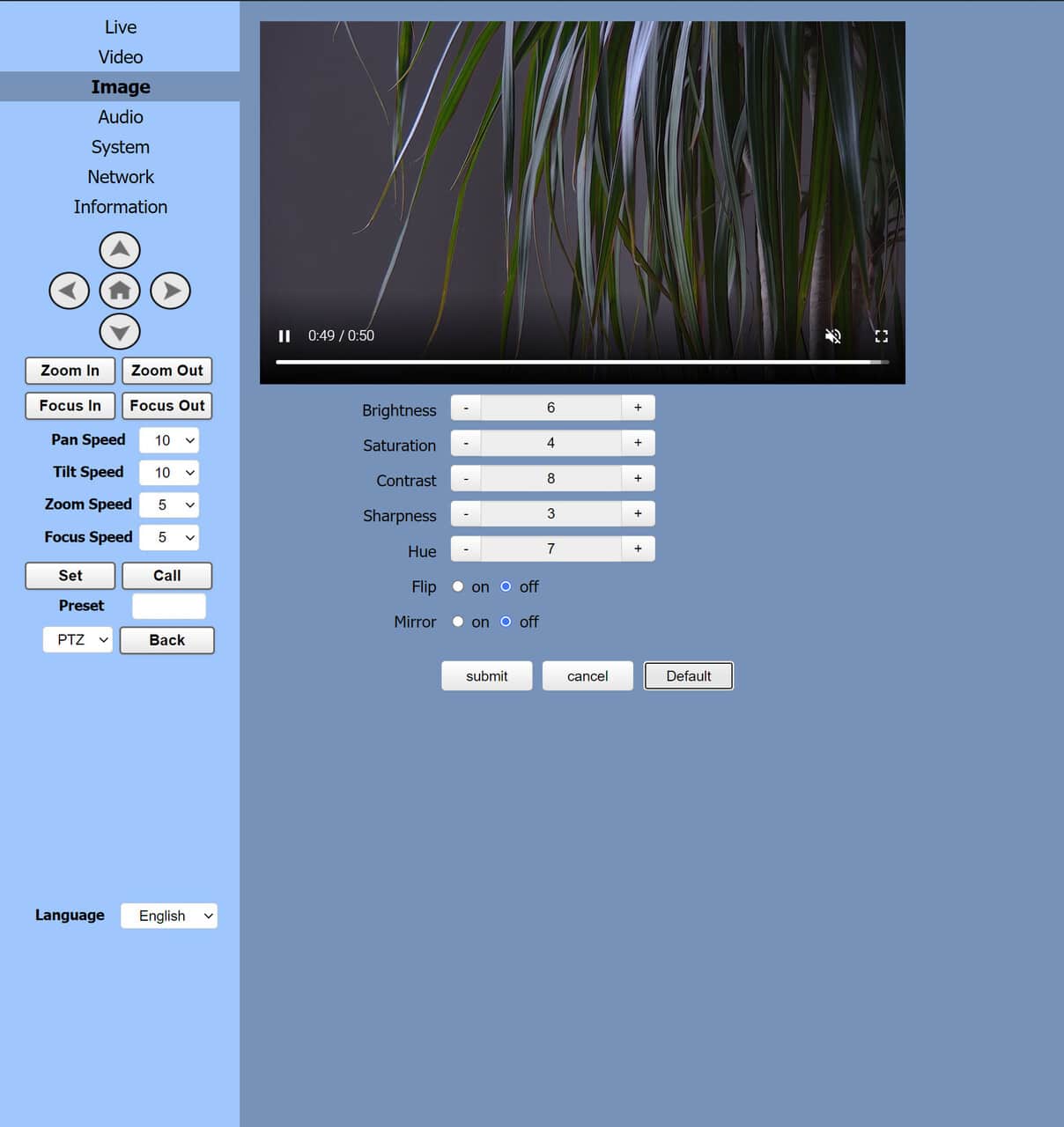 Die Kamera kann über die gängigen Protokolle, allen voran NDI und VISCA aber auch PELCO-D/P, gesteuert werden. Über das Browserinterface lassen sich, anders als bei manchen Mitbewerbern, auch die dafür verwendeten Ports definieren, um die Kamera mit der Steuerung zu verbinden. Über das eigene Browserinterface lassen sich die PTZ-Funktionen sowie die grundlegenden Systemeinstellungen zwar konfigurieren und mittels Live-Bild nachverfolgen, auf umfangreichere Optionen für beispielsweise den Weißabgleich muss man dort jedoch verzichten. Diese wichtige Funktion ist ebenso wie etwa die manuelle Blende nur über das OSD- Menü und die beiliegende Fernbedienung aufrufbar.