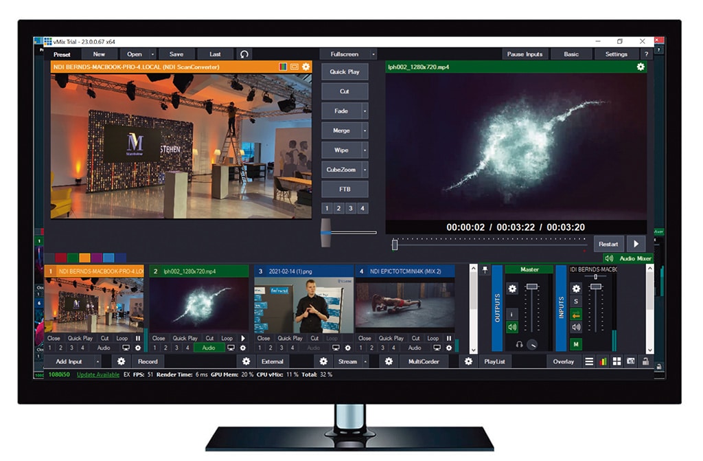 Studiocoast PTY Ltd. entwickelte 2009 um Firmenchef Martin Sinclair eine erste Version der Mix- und Streaming-Software vMix – mittlerweile in Version 23. Schon lange bevor die Veranstaltungsszene auf solche Streaming-Produkte aufmerksam wurde, füllte dieses Produkt eine Lücke für Gamer und Webbroadcaster. Die windowsbasierte Software kann aufgrund der langen Entwicklungszeit inzwischen sehr viel und arbeitet, wie keine andere Software, sehr zuverlässig mit NewTek’s Video-over-IP-Standard NDI. Diese IP-basierte Video-Transportmöglichkeit schafft, gerade in Zeiten, in denen Latenz eine eher untergeordnete Rolle spielt, viele neue Möglichkeiten und scheint sich gegenüber anderen Protokollen durchzusetzen. In einem optimal konfigurierten Gbit-Netzwerk kann inzwischen für HD-Signale eine Latenz von bis zu einem Frame erreicht werden, was einige konventionelle Bildmischer in Sachen Geschwindigkeit schlägt.