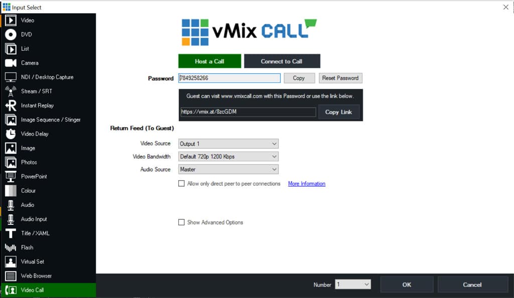 Mit dem integrierten Tool „vMix Call“ können stabil und einfach externe Teilnehmer in guter Qualität zugeschaltet werden, die auch automatisch akustisch mit n-1 konfiguriert werden. Es wird ein Schlüssel erzeugt, mit dem externe Teilnehmer sich einfach per Browser ohne Wasserzeichen einwählen können. Leider bietet vCall dem externen Sprecher nicht die Möglichkeit, seinen Bildschirm zu teilen. Dies kann besser über eine NDI-taugliche App wie Microsoft Teams realisiert werden. Hiermit lassen sich sowohl die einzelnen Teilnehmer einer Konferenz als auch geteilte Bildschirme als separate NDI-Inputs anlegen und ohne erhöhten Verkabelungsaufwand variabel im Sendebild anordnen und mischen.