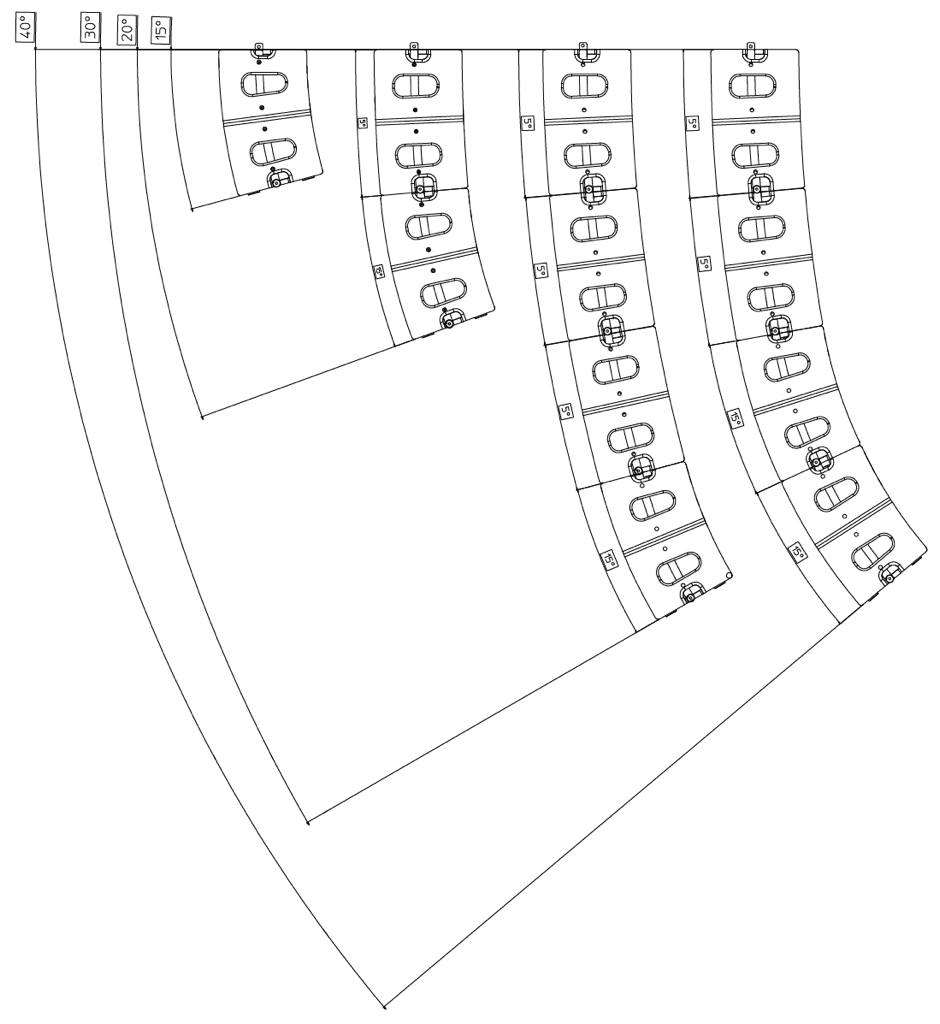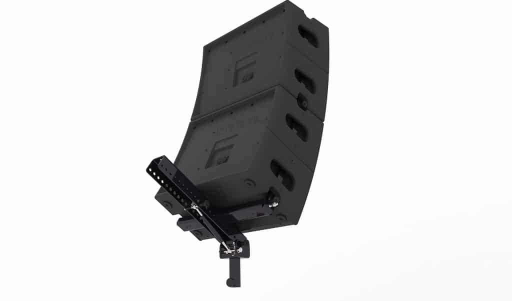 Blickt man von der Seite auf die Gehäuse der Ikarray-8, dann wird das „Zwei in eins“-Gehäusekonzept mit 5° oder 15° Winkel deutlich. Gut zu erkennen ist dabei auch die elegant untergebrachte Flugmechanik, die im jeweiligen Krümmungswinkel, nur erkennbar hinter den Griffschalen, verläuft. Die Gehäuse hängen daher im Array ohne Spalt vorne oder hinten immer dicht gepackt. Optisch erscheint ein Ikarray-8 System so als homogene Einheit ohne auffällige Mechanik. Das sonst manchmal sehr technische Erscheinungsbild eines Line-Array wird damit geschickt vermieden. Abb. 1 zeigt dazu einige Beispiele für Array-Konfigurationen mit bis zu vier Einheiten im geflogenen Zustand. In einem 4er-Array wird man typischer Weise oben zwei oder drei 5°-Elemente hängen und darunter die 15°-Systeme. Oben erreicht man damit eine höhere Leistungsdichte auf den Raumwinkel bezogen und somit auch eine größere Reichweite für weiter entfernt gelegene Zuhörer. Mit dem größeren Öffnungswinkel zum unteren Ende hin wir die Leistungsdichte für die nahen Publikumsbereiche reduziert.