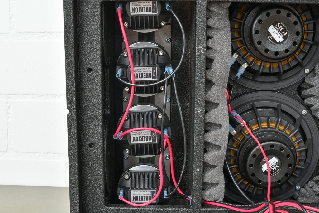 Auf der anderen Seite reihen sich dicht an dicht vier 1″-Hochtontreiber. Die vom Hersteller Oberton stammenden Treiber sind bereits mit einem Line-Array Waveformer ausgestattet, der die kreisrunde Treiberöffnung auf den schmalen Spalt für die Linienquelle adaptiert. Der im bulgarischen Plovdiv ansässige Hersteller entwickelt und produziert hier seit 1989 Lautsprecherchassis für den professionellen Einsatz und erfreut sich eines außerordentlichen guten Rufes in der Branche. Voice-Acoustic-Entwickler Henry Dahmen setzt vor allem wegen ihres seidig angenehmen Klangs auf die Oberton-Treiber.